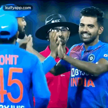 Deepak Chahar, Rohit Sharma, and KL Rahul celebrate his selection for the India T20i squad with high-fives.