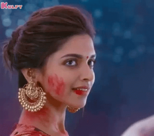 Deepika Padukone winks playfully, her face adorned with red paint, in a close-up shot.