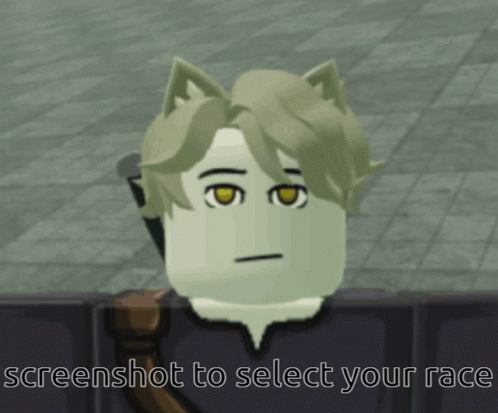 Deepwoken Felinor character upside down with text 'screenshot to select your race' for game race selection.