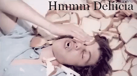 A person lies in a bed of bread slices, happily eating more bread, expressing delight with 'Hmmm Delicious'.