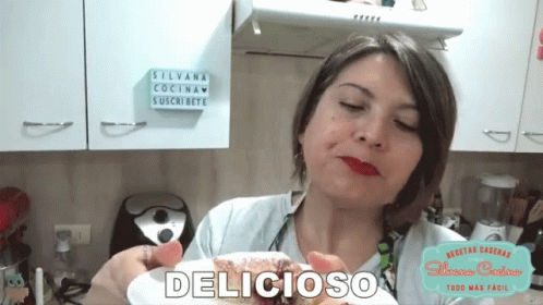 Silvana Cocina enjoys a delicious dessert, taking a bite with a fork, with her channel name visible in the background.