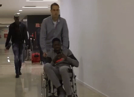 Dembele, seated in a wheelchair, waves to the camera while being pushed down a hallway.