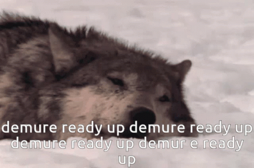 A demurewolf, Wooba, sleeping in the snow with 'demure ready up' text overlay.