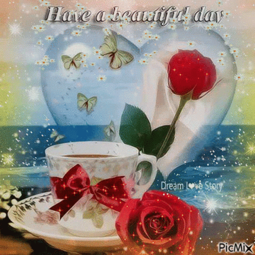 A beautiful animated scene with a teacup, red roses, butterflies, and a sparkling heart.
