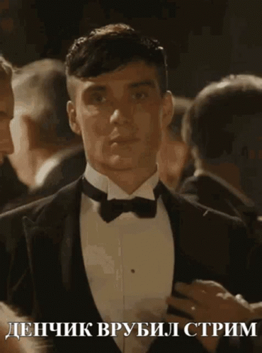 Denchik, a young man in a tuxedo, looks intently at the camera as he starts his stream.