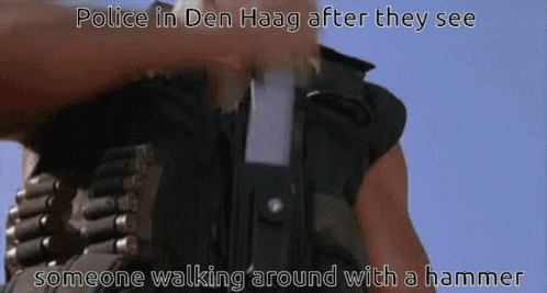 Den Haag police prepare for action after spotting someone with a hammer, featuring Arnold Schwarzenegger.