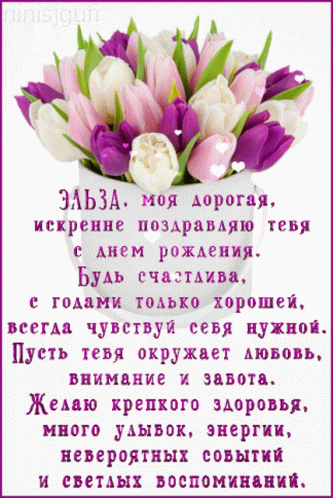 Elsa receives a heartfelt birthday greeting with a beautiful bouquet of pink, white, and purple tulips.