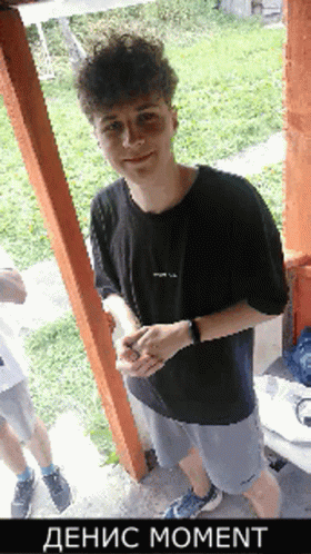 A young man, Denis, stands on a porch, creating a 'Denis Moment' with his friends.