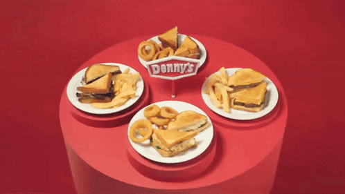 A rotating display of various delicious melt sandwiches and sides from Denny's Restaurant, including fries and onion rings.