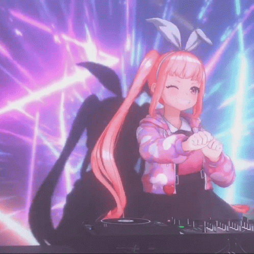 Sakurano Mimito, the pink-haired anime girl from Denonbu, dances and winks behind a DJ controller at a vibrant party.