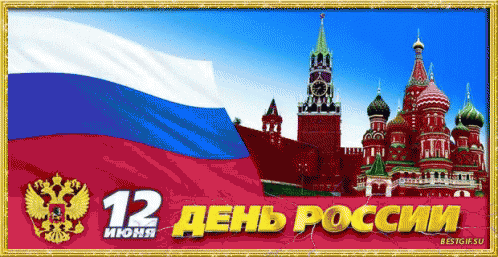 A picture celebrating Russia Day, featuring the Russian flag and the Kremlin clock tower with the date '12'.