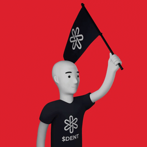 A 3D animated Wojakfan character wearing a $DENT t-shirt and waving a black flag with the Dent logo.