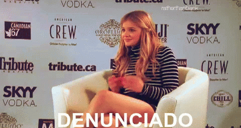 Chloe Moretz giving thumbs up with "Denunciado" meme text overlay, at an event with various brand logos.