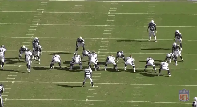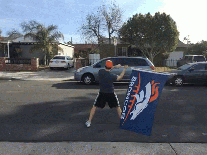 A man enthusiastically waves a large Denver Broncos flag in a residential street.