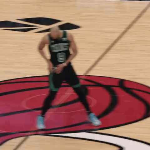 Derrick White of the Boston Celtics performs his signature pocket celebration after a three-point shot.