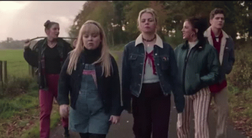 The cast of Derry Girls, including Erin, Nicola Coughlan, Dylan Llewellyn, Louisa Harland, and Jamie Lee, walk down a rural road.