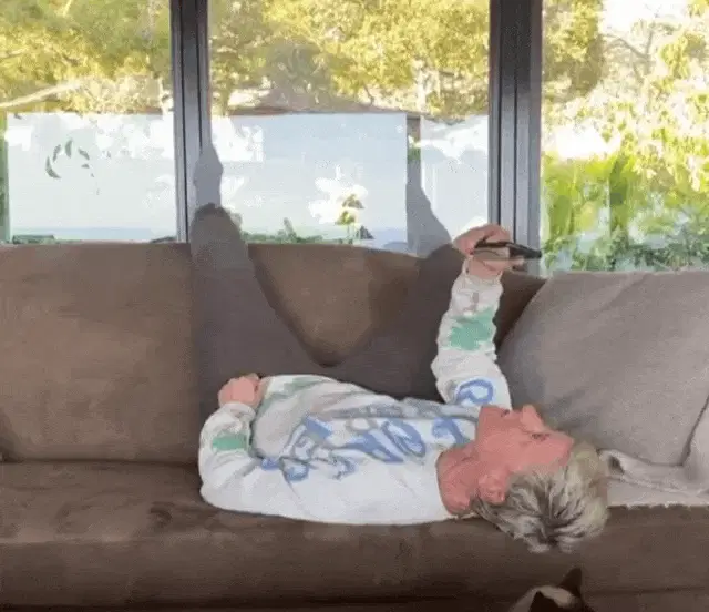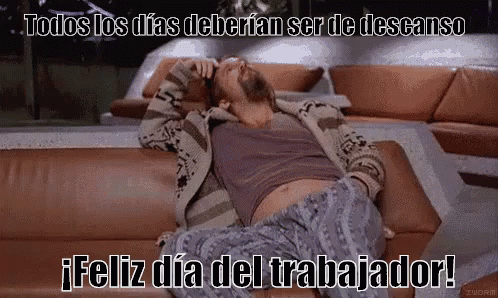 A man resembling The Guy relaxes on a couch, celebrating Labor Day with the wish for every day to be a day off.