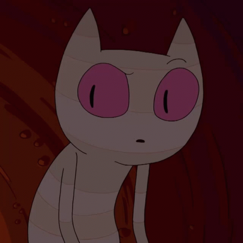 Mi Miau, the cartoon cat from Adventure Time, looks confused and disconcerted with large pink eyes.