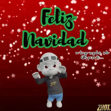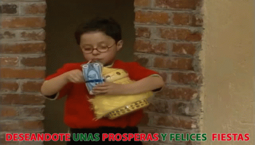 Young boy from La Familia Peluche drinks from a juice box, wishing prosperous and happy holidays.