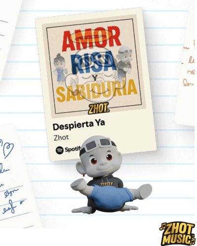 a cartoon character is standing next to a poster that says amor risa y sabiduria