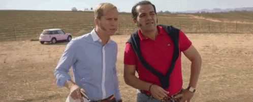 Two men, looking confused and lost, stand in a dry field with a pink Mini Cooper in the background.