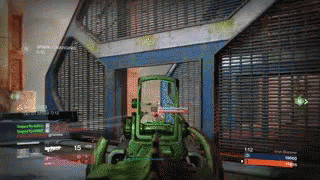 First-person shooter gameplay in Destiny, featuring a 'Cheers' moment during intense combat with a green weapon.