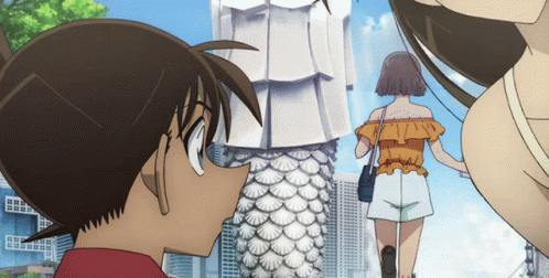 Ran Mouri leans in close to Conan Edogawa, who looks surprised, in a scene from Detective Conan.