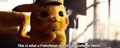 Detective Pikachu, wearing a hat, delivers the memorable 'caliente fiesta' line.