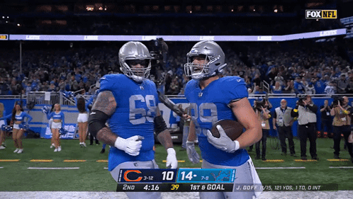 Detroit Lions' Brock Wright celebrates a touchdown with a teammate during an NFL game.