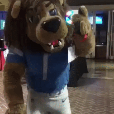 Detroit Lions mascot Roary spins a fidget spinner while wearing its blue and white uniform.