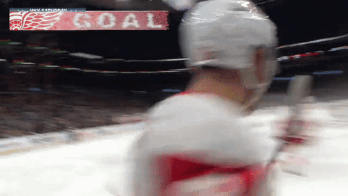 Andrew Copp of the Detroit Red Wings celebrates a goal during an NHL hockey game.