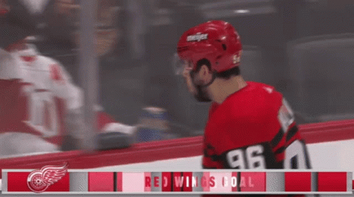 Jake Walman of the Detroit Red Wings celebrates a goal during an NHL hockey game.