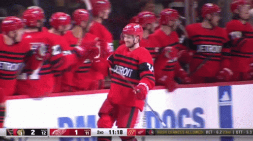 Pius Suter of the Detroit Red Wings celebrates a goal with his teammates on the bench during a hockey game.
