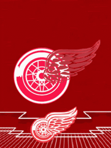 Animated 3D Detroit Red Wings logo spinning on a red background, with a static logo below.
