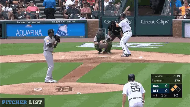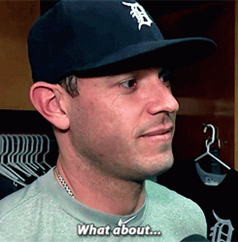 A Detroit Tigers player, wearing his team cap, smiles after saying 'What about...' in an interview.