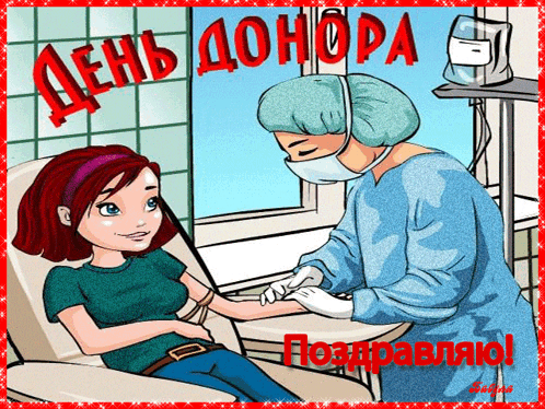 A cartoon drawing of a girl doctor giving a blood donation to a woman.