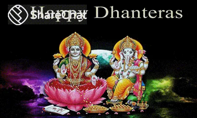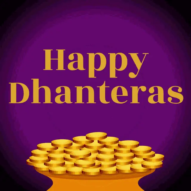 A vibrant graphic wishing 'Happy Dhanteras' with traditional Indian symbols like a kalash, conch, and Ayurveda book.