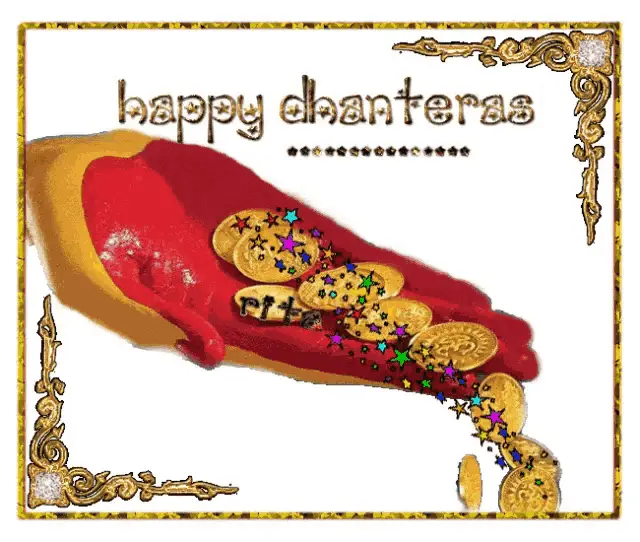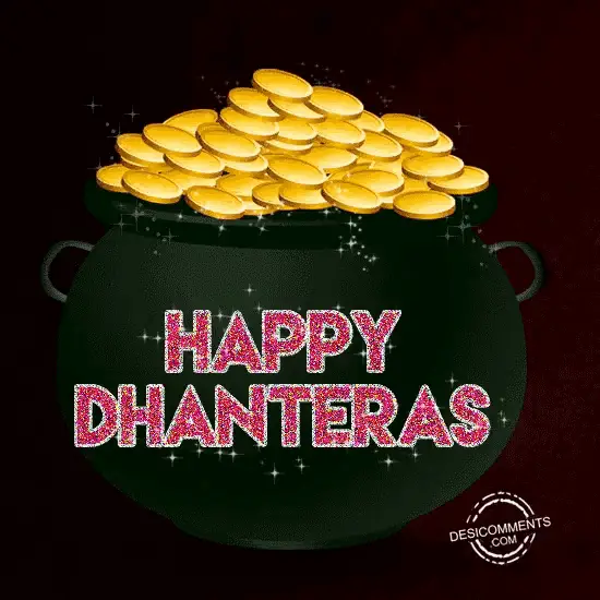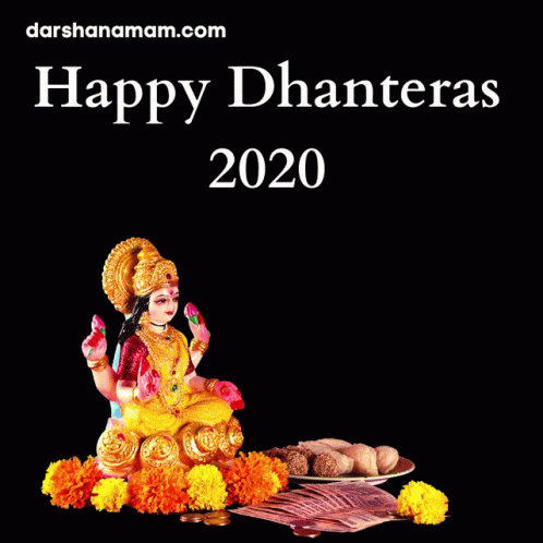 Celebrate Happy Dhanteras 2020 with Goddess Lakshmi, gold coins, and Indian Rupees, wishing for wealth and creativity.