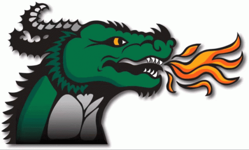 A cartoon green dragon, the Dhs Dragons Duxbury Boosters mascot, breathes fire with intensity.