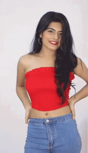 Dhwani Bhatt poses charmingly in a red crop top and blue jeans, showcasing her beauty and style.