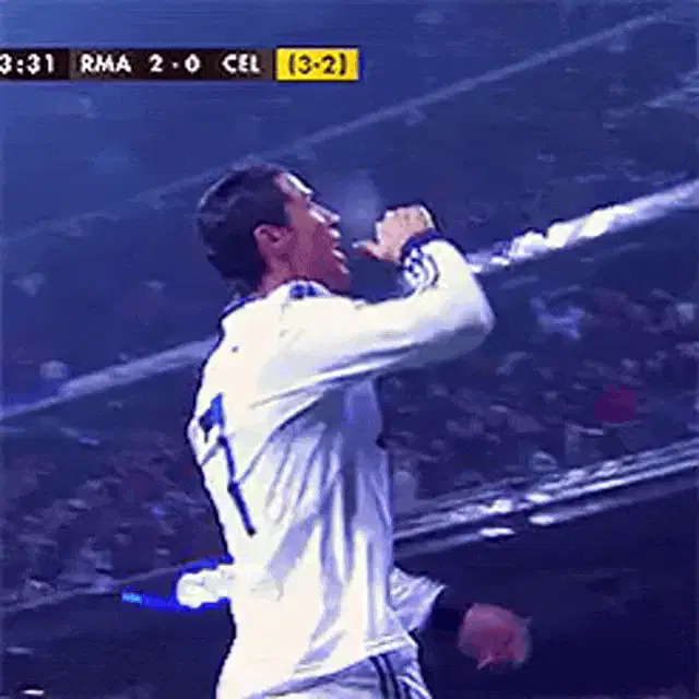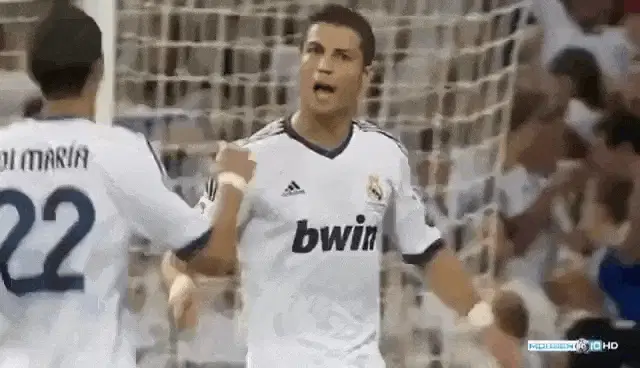 Angel Di Maria performs a skill move on the field, with Cristiano Ronaldo nearby during a football match.