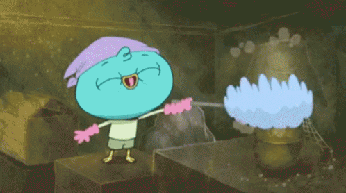 An enthusiastic cartoon character with a purple hat and pink gloves joyfully cleans, proclaiming "Time for Cleaning!"