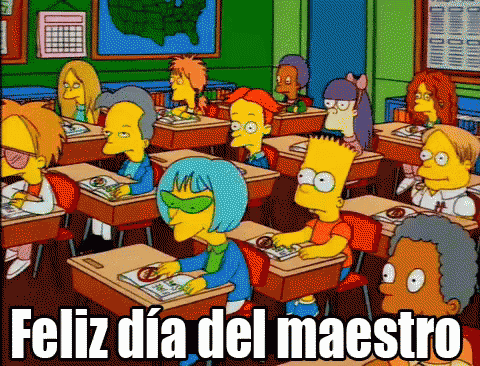 The Simpsons characters in a classroom celebrating Teacher's Day with the text 'Feliz día del maestro'.