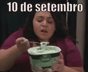 A woman is eating ice cream with a spoon from a cup, celebrating Dia Do Gordo on September 10th.