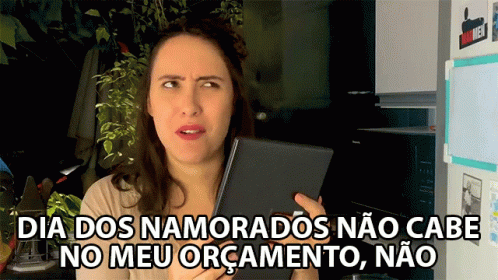 A woman holds a tablet, expressing that Valentine's Day doesn't fit her budget.