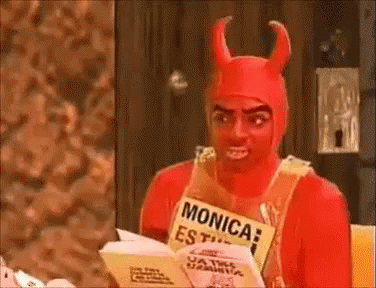 Eugenio Derbez as the little devil character, reading a book and pointing with a sign for Monica.