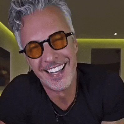 Diego Riendo laughs heartily, wearing orange-tinted sunglasses and a black shirt in an indoor setting.
