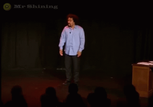 Comedian Dieudonné M'bala M'bala on stage, pointing and delivering the line 'Tu vas la prendre celle-là !!'