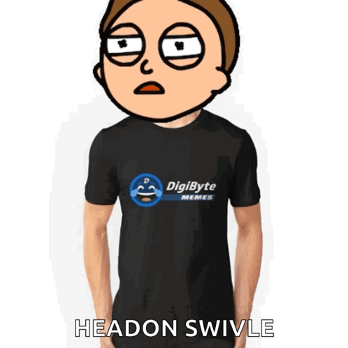 A cartoon head, reminiscent of Rick and Morty, spins while wearing a 'DigiByte Memes' t-shirt.