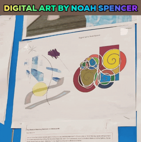 Noah Spencer's digital art displayed on a blue bulletin board, featuring abstract and surreal pieces.